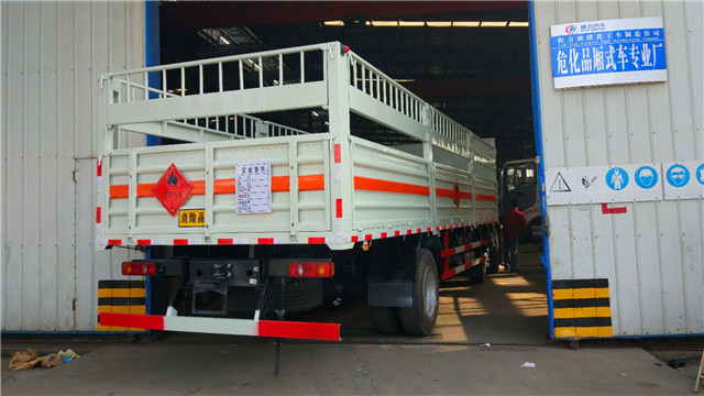 東風天錦小三軸8.6米氣瓶運輸車采用東風天錦前四后四底盤,也叫東風天錦前四后四氣瓶運輸車,該車采用康明斯210馬力發動機,整車尺寸(11.1米*寬2.55米*高3.04米),廂體內尺寸長8.6米*寬2.45米*高0.8米,采用倉欄式結構,該車為危險品貨物運輸車,用于運輸具有獨立容器(瓶)包裝的易燃氣體(罐(瓶)裝壓縮氫、液化石油氣),類項號為2.1,和非易燃無毒氣體(罐(瓶)裝二氧化碳,氧氣,氮氣,氬氣),類項號為2.2。