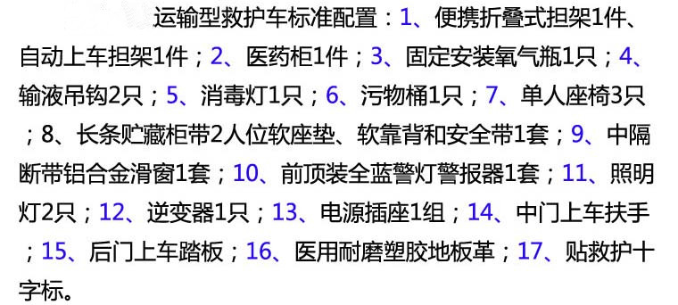 | 其它 | 1.車內(nèi)裝置藥柜、擔(dān)架、氧氣瓶、輸液掛鉤等專用裝置;2.隨底盤選裝中頂時(shí)整車高度為2490mm;隨底盤選裝高頂時(shí)整車高度為2875mm;3.ABS系統(tǒng)控制器型號(hào):APG3550500G;ABS系統(tǒng)控制器生產(chǎn)企業(yè):浙江亞太機(jī)電股份有限公司;發(fā)動(dòng)機(jī)最大凈功率83KW;4.隨底盤選裝后踏步板,對(duì)應(yīng)整車長度為5696mm,不選裝后踏步板時(shí)對(duì)應(yīng)整車長度為5496mm;隨底盤選裝輪罩蓋,選裝前霧燈,選裝黑色前大燈;6.車身可選裝爆閃燈.車頂可選裝圓柱形爆閃燈. | ||