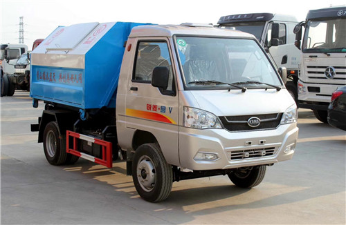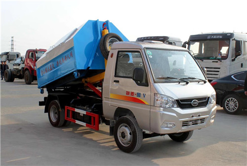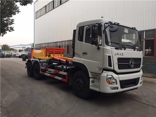 車廂可卸式垃圾運輸車(又稱拉臂式垃圾運輸車)是由一輛備有液壓拉臂裝置的底盤和一只可卸式集裝箱組成。液壓拉臂機構可以將放置在地面上的可卸式集裝箱從地面上拖拉到底盤上,或者從底盤上將集裝箱放到地面上。同時可以利用液壓拉臂機構將集裝箱在底盤舉升,使集裝箱內垃圾實現后傾式卸載。車和集裝箱可以像牽引拖掛列車式運輸車一樣分離。車將空集裝箱放下,再拉上滿載集裝箱即可運輸。液壓車廂可卸式機構既可以作為集裝箱上車的拖拉機構,又可作為集裝箱內垃圾后傾式卸載的卸載機構,一舉兩得。