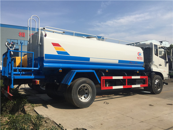 灑水車具有前沖、后灑、側(cè)噴(更換噴頭后變?yōu)閭?cè)花灑)、后置式工作平臺(帶踏梯,四周有安全護(hù)欄)、平臺上設(shè)置有高壓水炮(可360°旋轉(zhuǎn),可調(diào)成柱狀最大射程28米,也可調(diào)成霧狀最大射程14米,可調(diào)成:直沖狀、大雨、中雨、小雨、毛毛雨),整車灑水寬度大于14米.配備優(yōu)質(zhì)大功率專用灑水泵,取力器,雜物過濾網(wǎng),國標(biāo)通用65型消防接口(可通過消防栓加水)、1套自流球閥系統(tǒng)(可自吸自排,最大吸程6米),2根引水鋼絲膠管(帶陰陽快速接頭),配鎖,水位計,作業(yè)高音喇叭.兩側(cè)及后加強(qiáng)型保險杠,防滑爬梯,膠管儲存筒。