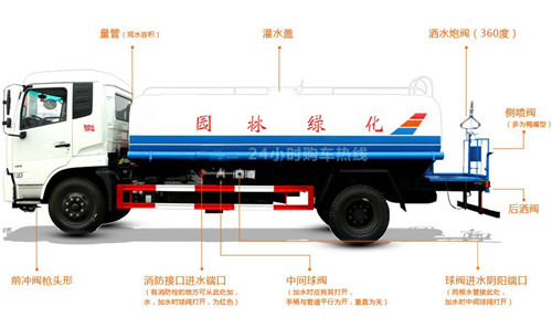 灑水車主要由汽車底盤、水罐、取力器、灑水泵、管網系統、后工作平臺等組成,其中,灑水車后工作平臺上主要安裝有綠化灑水高壓炮,側噴,后灑等噴灑裝置,工作平臺主要由3mm防滑板制作,還有方便上下平臺的用鋼筋與角鐵焊接的簡易踏步,和保證灑水車工作人員在操作灑水炮過程中的人身安全的防護欄,防護欄上一般設有警示標語,上面噴涂“隨時停車,注意安全”等字樣,提醒后車注意減速或避讓,與工作平臺后部相連的則是底盤防撞護欄。